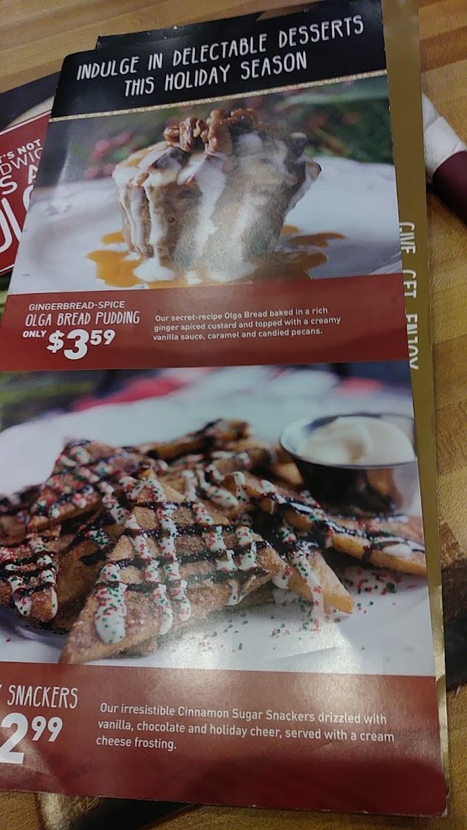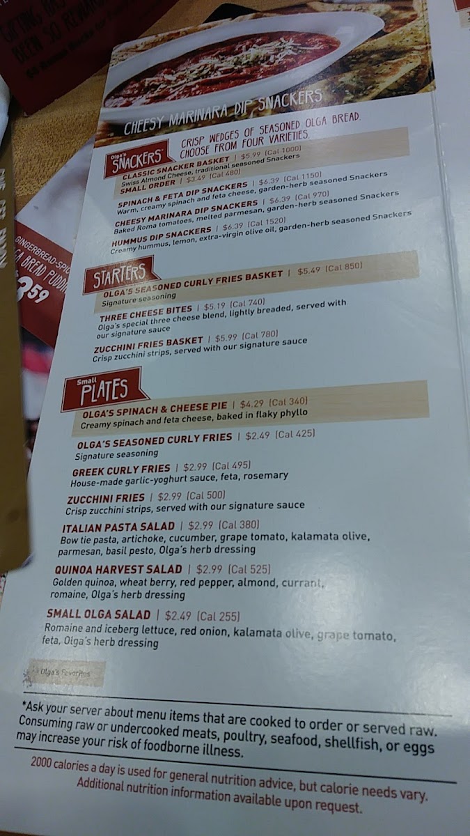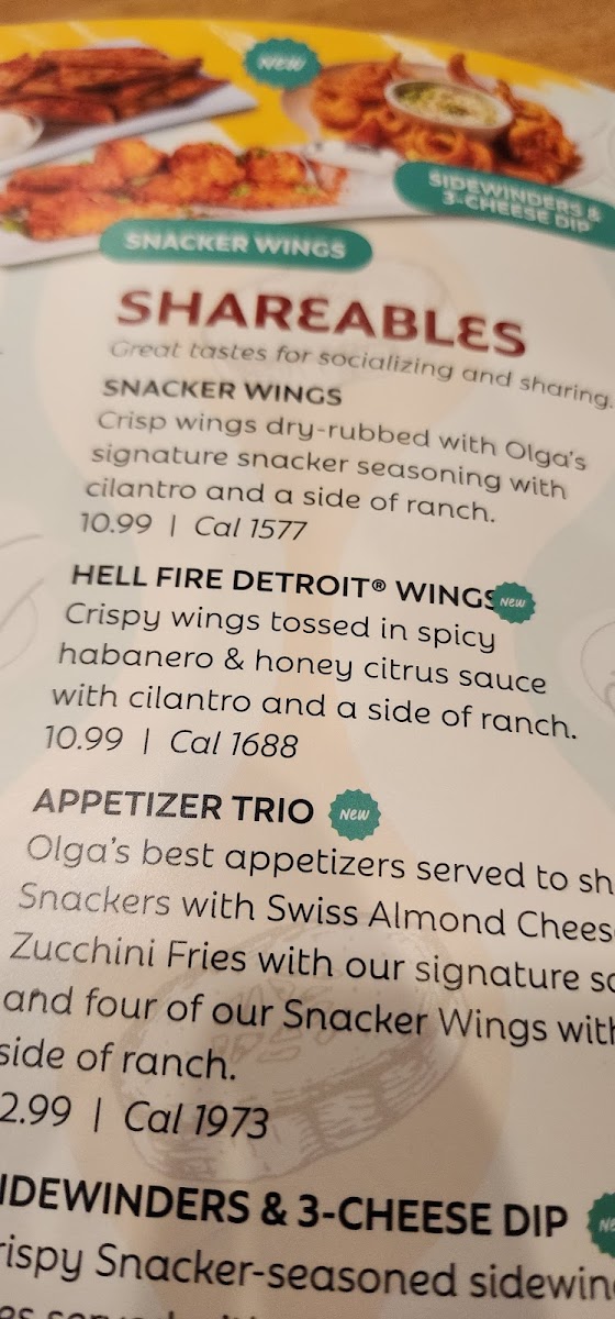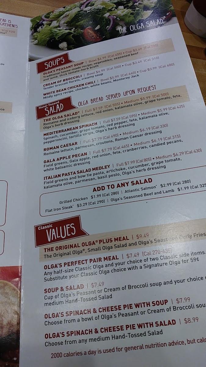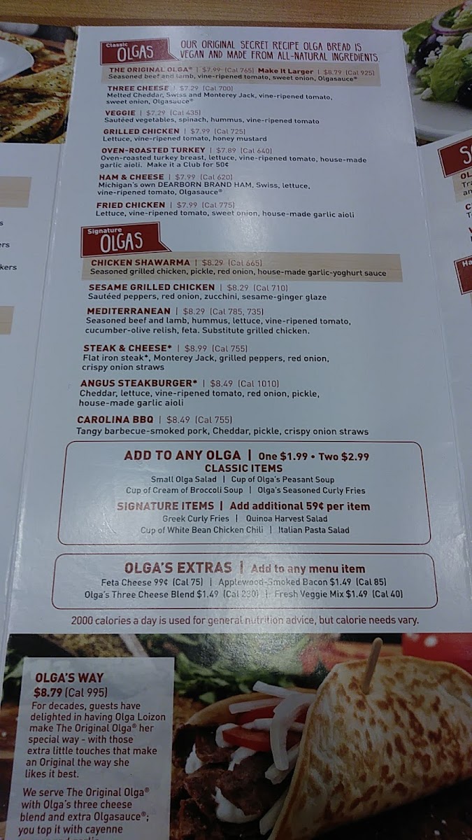 Overall, the menu at Olga’s Kitchen in Westland offers a well-rounded and comforting dining experience that stays true to the brand’s Mediterranean-inspired roots while still appealing to a wide range of tastes. From the moment you start with Olga's Snackers® Basket, Tempura Shrimp, or Zucchini Fries Basket, the appetizer selection sets a casual, shareable tone that’s perfect for groups. The Snacker Wings and Olga's Appetizer Trio further reinforce that social, indulgent vibe. Moving into heartier options, the soups like Peasant Soup, Cream Of Broccoli, and White Bean Chicken Chili provide warm, familiar flavors that balance the menu nicely. The signature sandwiches, especially The Original Olga® and Hell Fire Detroit® Spicy Chicken Olga, remain the clear stars, while options such as Mediterranean Grilled Chicken and Angus Steakburger add variety. For guests looking for lighter or more modern presentations, bowls like Beef & Lamb Bolga and Falafel & Hummus Bolga deliver satisfying, well-balanced meals. The Greek Fajitas - Steak and Greek Fajitas - Chicken bring a fun, interactive element, while salads such as The Olga Salad® and Honey Bourbon Salad With Chicken offer freshness without sacrificing flavor. Families are well served with bundles like Family Bundle and kid-friendly choices including Kids Original and Kids Mac & Cheese. Drinks such as Fresh Squeezed Lemonade and Orange Cream Cooler™ pair well with the food, and desserts like Baked Apple & Cinnamon Olga and Olga Donuts provide a comforting finish. Altogether, Olga’s Kitchen’s menu feels thoughtfully curated, familiar yet flexible, making it easy to find something enjoyable no matter the occasion.